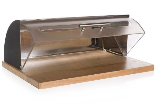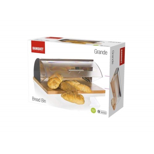 Chlebník GRANDE 39 cm slouží k uchovávání všech druhů pečiva. Je vyroben z nerezu v matovém provedení, víko plast, základna dřevěná - gumovníkové dřevo, výška 1,60 cm, typ nerezu: 18/0, síla nerezi 0,40 mm, rozměry: 39 x 28,5 x 15 cm.