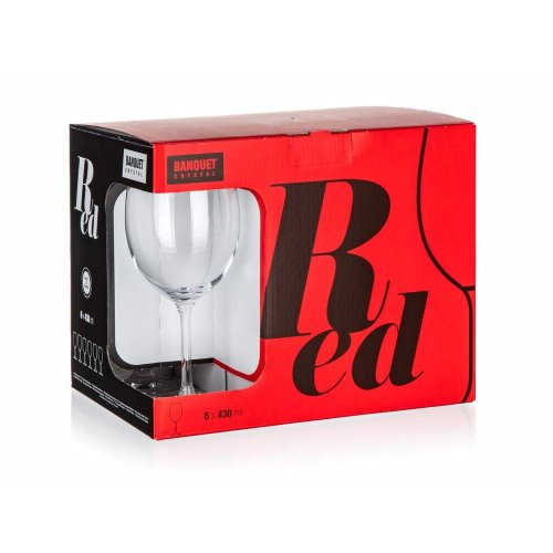 6dílná sada sklenic značky BANQUET CRYSTAL na červené víno, objem 430 ml v ozdobném obalu. Sklenice jsou vyrobeny z velmi kvalitního skla české výroby.