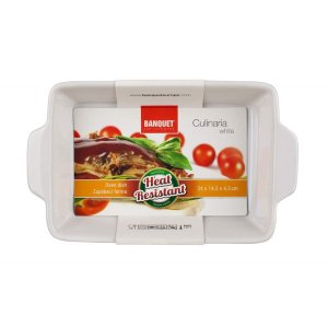 Keramická obdélníková zapékací forma 24 x 14,5 cm CULINARIA White s praktickými držadly pro snadnou manipulaci, výška formy 4,5 cm, bílá glazura, vnější strana formy má vlnkový reliéf. Keramické formy rovnoměrně absorbují teplo a postupně ho uvolňují, díky čemuž se pokrmy dobře propečou.