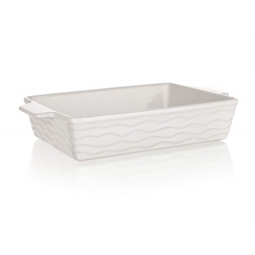Keramická obdélníková zapékací forma 33 x 21 cm CULINARIA White s praktickými držadly pro snadnou manipulaci, výška formy 6,5 cm, bílá glazura, vnější strana formy má vlnkový reliéf. Keramické formy rovnoměrně absorbují teplo a postupně ho uvolňují, díky čemuž se pokrmy dobře propečou.