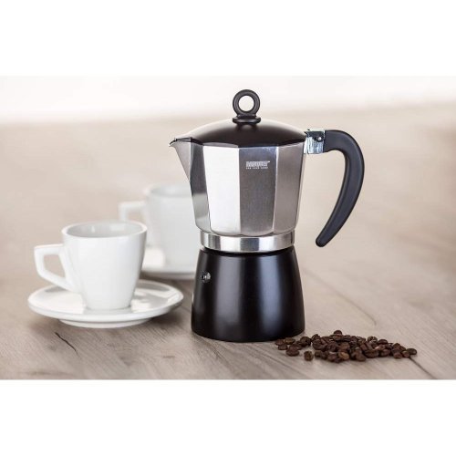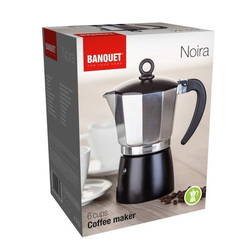 Kávovar NOIRA 6 šálků je tradiční kávovar pro domácí přípravu chutné silné kávy. Je vhodný pro použití na plynových, elektrických a sklokeramických deskách. Hliníkové tělo kávovaru již po několika šálcích získá patinu, která je pro správnou chuť kávy nepostradatelná. Kávovar je opatřen bezpečnostním ventilem. Využitelný objem 260 ml. Kávovar není vhodný pro mytí v myčce.