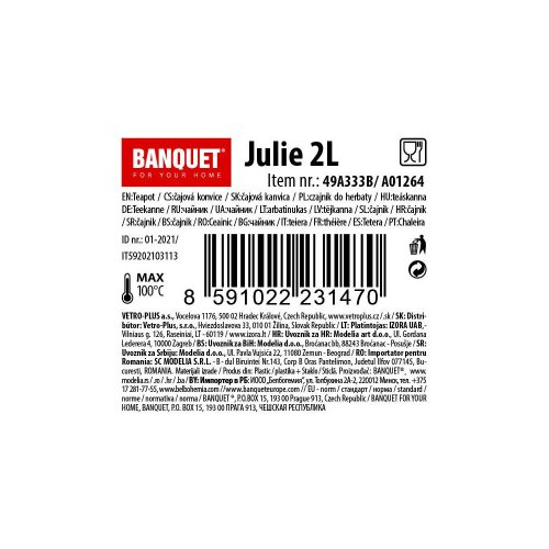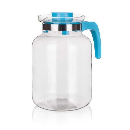Konvice JULIE 2 l je skleněná konvice s plastovými doplňky, odolnost skla do 100 st. C (sklo není varné), barevná provedení - oranžová, červená, modrá, zelená, hnědá, fialová.