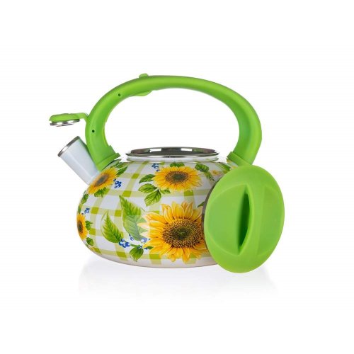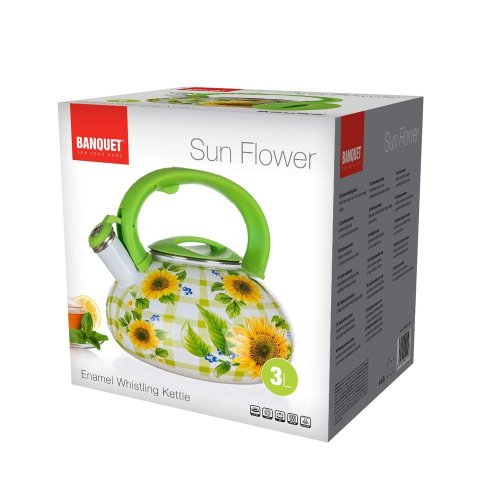 Smaltovaná konvice pískací 3 l SUN FLOWER je vyrobena z ocelového plátu s 2vrstvým smaltovaným nástřikem a dekorem ve stylu SUN FLOWER. Má plastové držadlo barevně laděné do designu konvice, snímatelnou píšťalu a dno opatřeno piktogramy o použití konvice.
