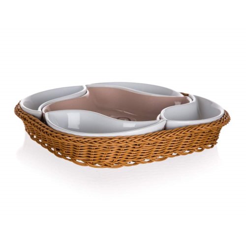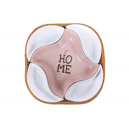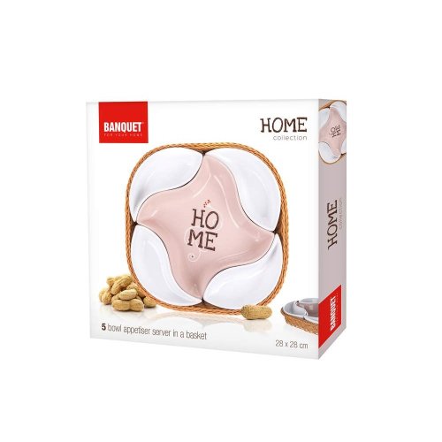 Mísa v košíku HOME o průměru 28 cm v proutěném PVC košíku 28 cm, je vhodná na podávání slaných i sladkých pochutin. Sada obsahuje: 4 x malou misku, 1 x velkou misku a 1 x proutěný PVC košík. Jedná se o oblíbenou kolekci keramiky s dekorem HOME, kterou můžete doplnit o další položky z této dekorované řady.