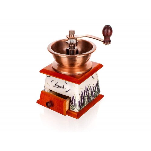 Ruční mlýnek na kávu s keramickým mechanismem, dekorované keramické tělo s dřevěnými doplňky a kovovou násypkou, keramickou mlecí mechaniku lze nastavit na požadovanou hrubost mletí.