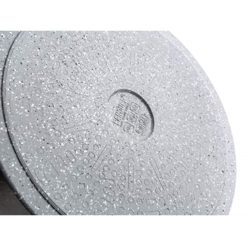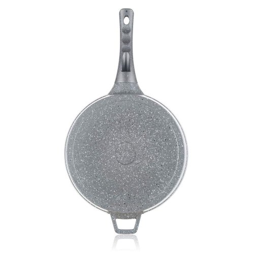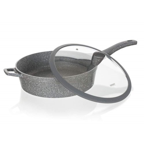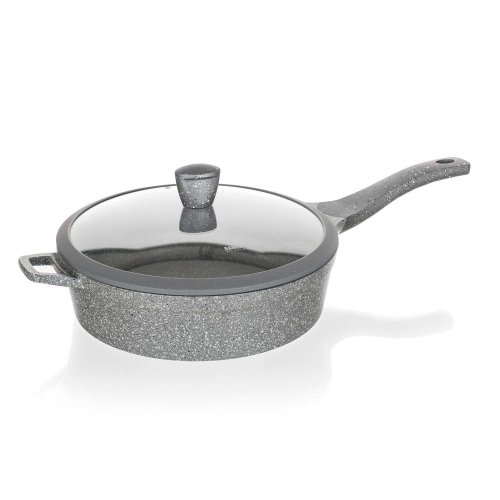 Hliníková hluboká pánev MARRONE o průměru 28 cm je opatřena vnitřním nepřilnavým povrchem, který zabraňuje připalování jídel při vaření. Pánev je vybavena skleněnou poklicí s knobem se silikonovým povrchem, který zajišťuje ochranu proti popálení při vaření. Ergonomická rukojeť se soft-touch povrchovou úpravou zaručuje snadnou manipulaci. Dno pánve je ošetřeno žáruvzdorným granitovým nástřikem. Pánev je dodávána v šedé barvě s granitovým dekorem.
