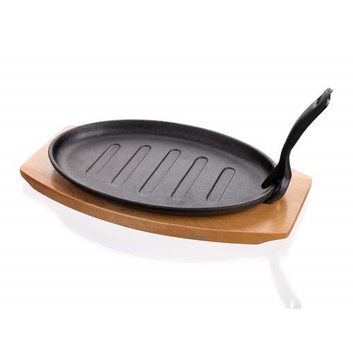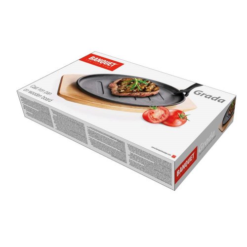 Litinová pánev 27 x 17,5 cm na dřevěném prkénku, odnímatelné litinové držadlo na vyndávání pánve z trouby. Pánev je vhodná pro zapékání pokrmů, lze jí použít pro přímé servírování, dřevěné prkénko slouží jako podložka pod horkou pánev. Pánev lze použít pro přímé servírování, dřevěné prkénko slouží jako podložka pod horkou pánev.