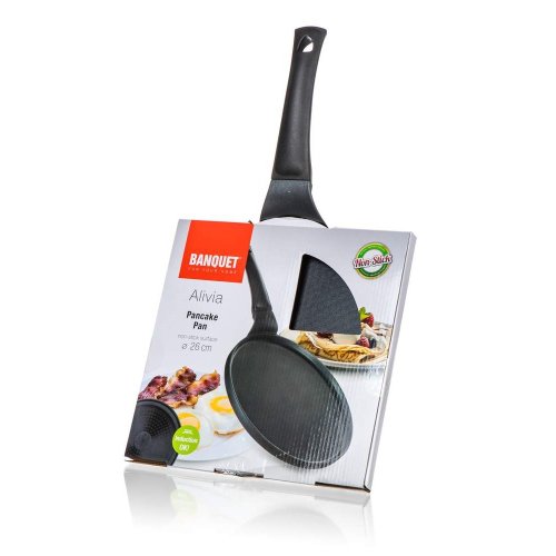 Litá hliníková pánev na palačinky ALIVIA 26 cm s indukčním dnem a vnitřním nepřilnavým povrchem Whitford Xylan, materiál: litý hliník. Pánev je vhodná na všechny typy sporáků včetně indukce. Lze ji použít na přípravu sladkých i slaných vaječných omelet a palačinek s minimální spotřebou tuku.