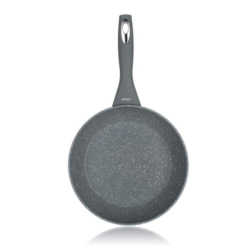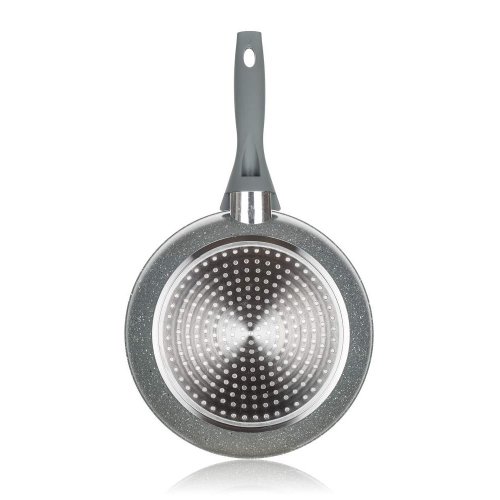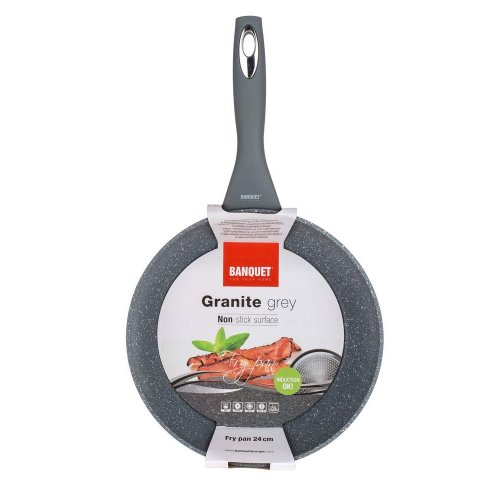 Hliníková litá kovaná pánev GRANITE GREY 24 x 4,8 cm s nepřílnavým povrchem, šedý granitový dekor, tloušťka stěny 3 mm, soft-touch rukojeť. Nepřilnavý povrch je velmi tvrdý a odolný proti poškrábání. Vysoká tepelná vodivost zajišťuje rychlé a ekonomické vaření - dlouho drží teplotu. Pánev je odolná proti nárazu a deformaci tvaru. Je vhodná na všechny typy varných desek včetně indukce.