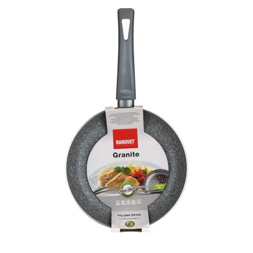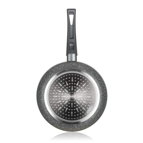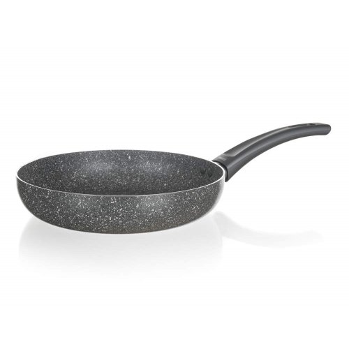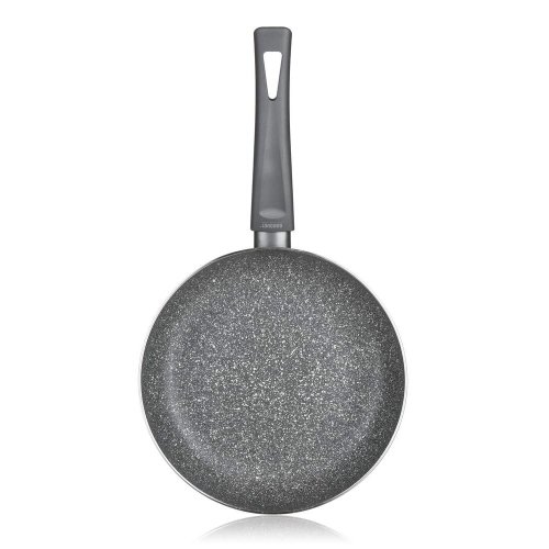 Hliníková presovaná pánev GRANITE 24 x 5 cm s nepřilnavým 2vrstvým povrchem v granitovém dekoru a šedou bakelitovou rukojetí se soft-touch povrchovou úpravou. Pánev je vhodná na všechny typy varných desek včetně indukce.