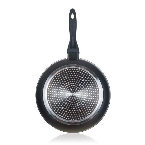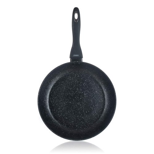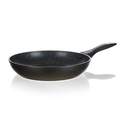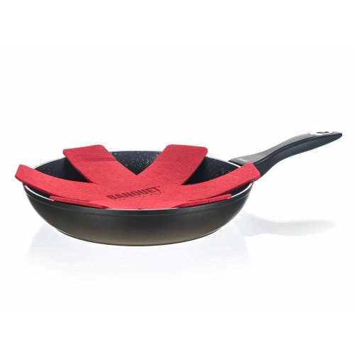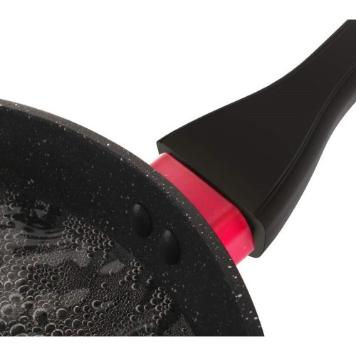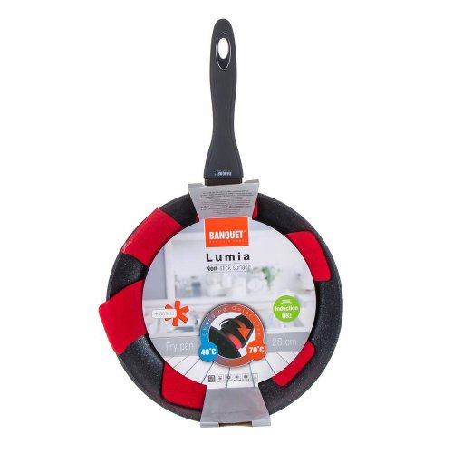 Kovaná hliníková pánev LUMIA 28 x 5,3 cm s 3vrstvým vnitřním nepřílnavým povrchem, vnější část v černém matném provedení s žáruvzdorným nástřikem. Pánev se vyznačuje novým technologickým prvkem, ochranný prstenec nad rukojetí se postupně se zvyšující teplotou mění z černé na sytě červenou barvu. Změna začíná při 40 st.C a postupně dochází k sycení červené barvy až do 70 st.C, kdy je pánev připravena k plnému vaření. Součástí balení je proložka na pánve v červené barvě.
