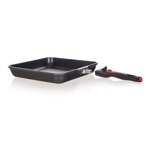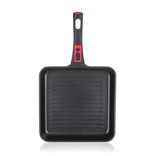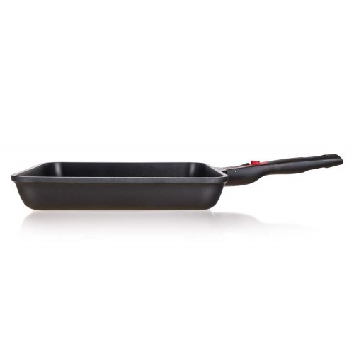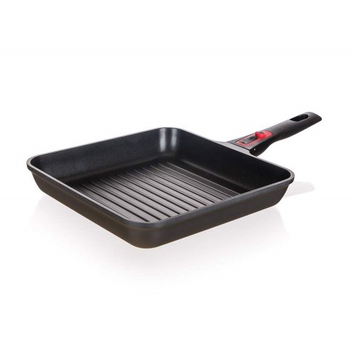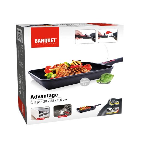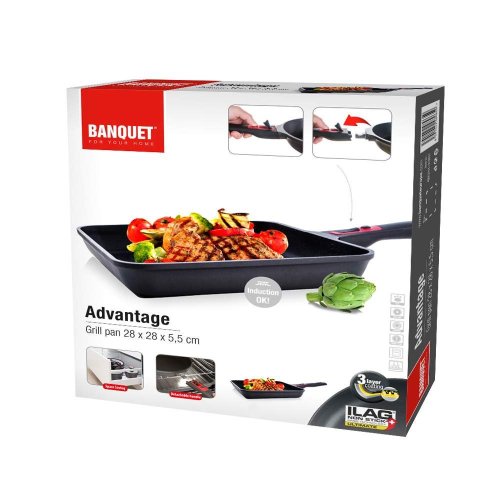 Litá hliníková grilovací pánev 28 x 28 x 5 cm s odnímatelnou rukojetí ADVANTAGE je opatřena vnitřním 3vrstvým nepřilnavým povrchem ILAG ULTIMATE SWISS Technology a vnějším žáruvzdorným 2vrstvým nástřikem. Pánev má bakelitovou rukojeť se soft touch povrchovou úpravou, kryté indukční dno pomocí žaruvzdorného nástříku a odnímatelnou rukojeť, která umožňuje použití pánve do trouby a zárověň pomáhá ušetřit prostor ve vaší kuchyni.