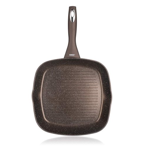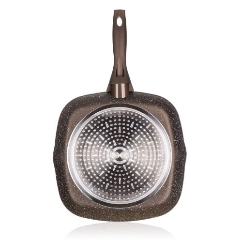 Hliníková litá kovaná steaková pánev PREMIUM DARK BROWN s nepřílnavým povrchem, rozměr 28 x 28 x 4,8 cm, hnědý granitový dekor, tloušťka stěny 3 mm, plně indukční dno, soft-touch rukojeť. Nepřilnavý povrch je velmi tvrdý a odolný proti poškrábání. Pánev je odolná proti nárazu a deformaci tvaru.