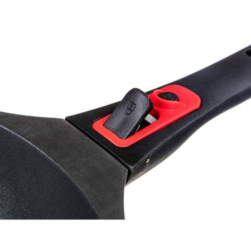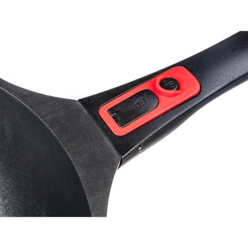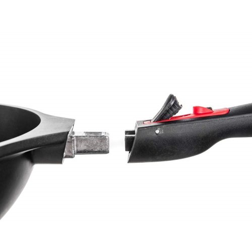 Litá hliníková WOK pánev se skleněnou poklicí s odnímatelnou rukojetí ADVANTAGE je opatřena vnitřním 3vrstvým nepřilnavým povrchem ILAG ULTIMATE SWISS Technology a vnějším žáruvzdorným 2vrstvým nástřikem. Pánev má bakelitovou rukojeť se soft touch povrchovou úpravou, kryté indukční dno pomocí žaruvzdorného nástříku a odnímatelnou rukojeť, která umožňuje použití pánve do trouby (bez poklice) a zárověň pomáhá ušetřit prostor ve vaší kuchyni. Poklice je opatřena silikonovým černým návlekem.