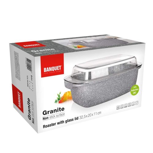 Pekáč GRANITE 5,7 l se skleněným víkem je opatřen nepřilnavým povrchem s granitovým vzorem. Rozměry: 32,5 x 21 x 11 cm, tloušťka stěny 2,2 mm, tloušťka dna 4,7 mm. Pekáč je opatřen celoindukčním dnem pokrytým nepřilnavým žáruvzdorným povrchem. Lze mýt v myčce na nádobí.