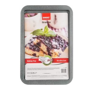 Plech pečící mělký Granite 43 x 29 x 2 cm, tloušťka dna a stěny 0,4 mm. Pekáče a pečící formy s nepřilnavým povrchem jsou nezbytným pomocníkem v každé kuchyni. Nepřilnavý povrch XYNFLON je vyroben na bázi PTFE (polytetrafluorethylen), je vysoce odolný, má prvotřídní antiadhézní vlastnosti a snadno se udržuje.