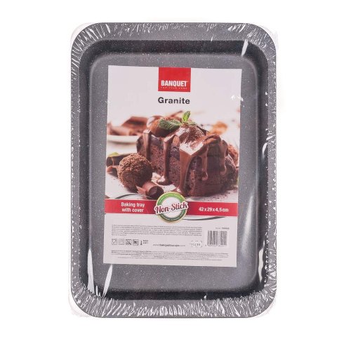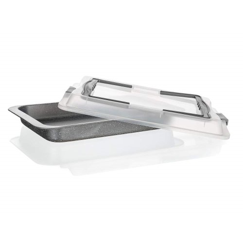 Plech s umělým víkem Granite 42x29x4,5 cm, tloušťka dna i stěn 0,4mm. Pekáče a pečící formy s nepřilnavým povrchem jsou nezbytným pomocníkem v každé kuchyni. Nepřilnavý povrch XYNFLON je vyroben na bázi PTFE (polytetrafluorethylen), je vysoce odolný, má prvotřídní antiadhézní vlastnosti a snadno se udržuje.