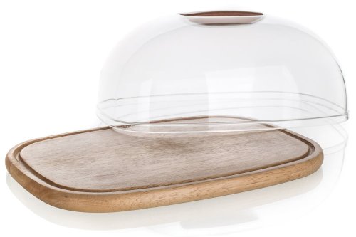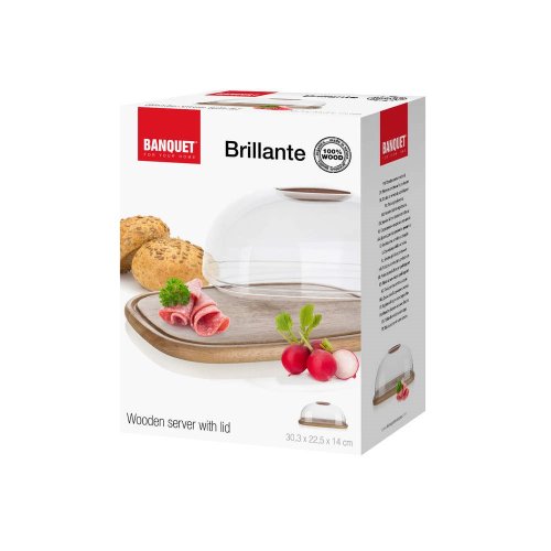 Prkénko servírovací s poklopem BRILLANTE o rozměrech 30,3 x 22,5 x 14 cm, podnos s rýhou z kvalitního gumovníkového dřeva, poklop acryl s dřevěným knobem.
