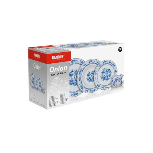 30dílná jídelní sada s tradičním dekorem ONION obsahuje: 6 x hluboký talíř, 6 x mělký talíř, 6 x dezertní talíř, 6 x podšálek, 6 x šálek. Nádobí lze používat do mikrovlnné trouby a mýt v myčce na nádobí.