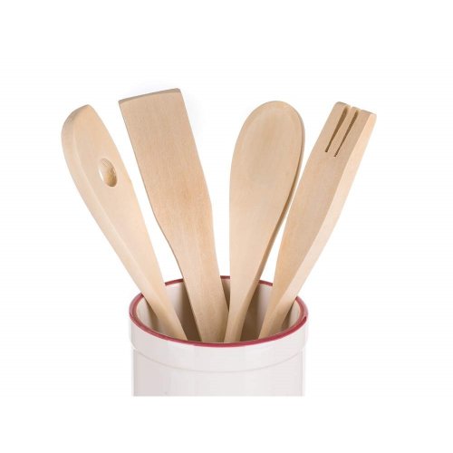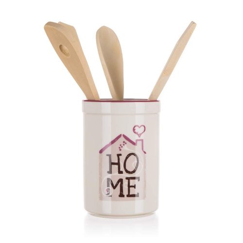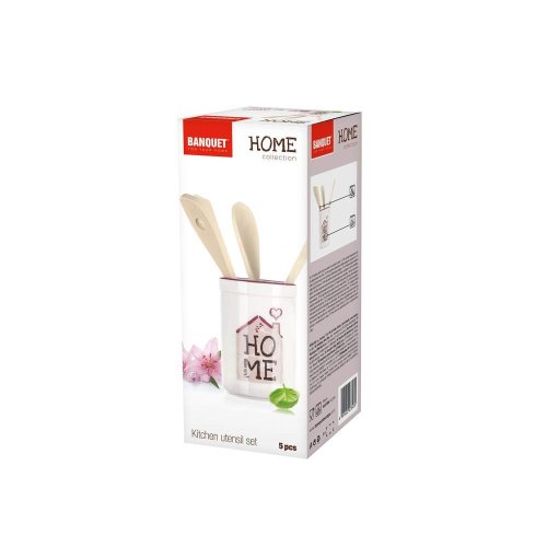 5dílná sada kuchyňského náčiní s dekorem HOME obsahuje: 1 keramickou dózu 13,5 cm a 4 různé dřevěné vařečky 25 cm. Lze použít do myčky, ale pro zachování dokonalého vzhledu doporučujeme umývat ručně. V nabídce máme další produkty z kolekce HOME.