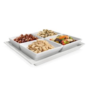 Servírovací porcelánová sada BIANCA v bílé barvě, se skládá z podnosu a 4 mističek. Rozměr tácu je 30 x 26 x 4 cm. Tato sada má široké využití. Podnos můžete využít na servírování jednohubek, chlebíčků, koláčů nebo mini dortíků. Do jednotlivých malých mističek můžete dát různé dipy, marmelády, sypání, oříšky, ovoce nebo zeleninu. Vhodné pro každodenní použití. Sada je vhodná do myčky na nádobí.