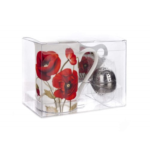 3dílná čajová sada Máky, sada obsahuje: 1x keramický hrnek o objemu 340 ml (výška 10,8 cm, průměr 7,6 cm), 1x kovové sítko, 1x tácek pod sítko.