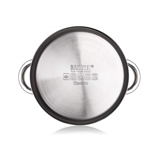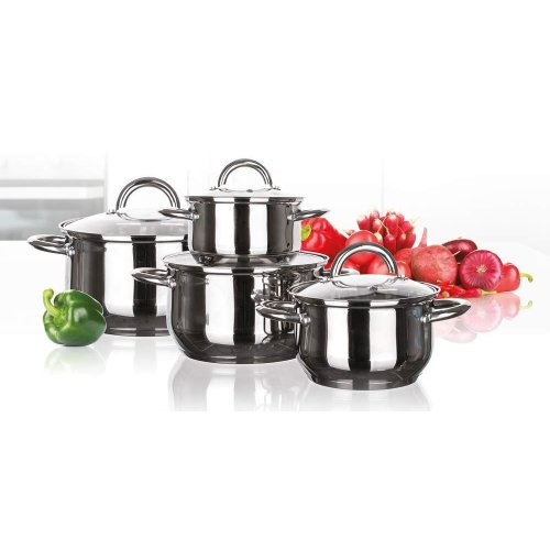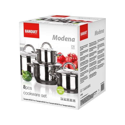 8dílná sada nerezového nádobí MODENA, sada obsahuje: hrnec s poklicí 14 x 9,5 cm, hrnec s poklicí 16 x 10,5 cm, hrnec s poklicí 18 x 11,5 cm, hrnec s poklicí 20 x 12,5 cm. Povrchová úprava hrnců - lesk (uvnitř i vně), na vnitřní straně měrky objemu, skleněné poklice. Držadla a knoby jsou nerezové, držadla jsou přichycena šrouby. Hrnce lze používat na všechny typy varných desek včetně indukce.