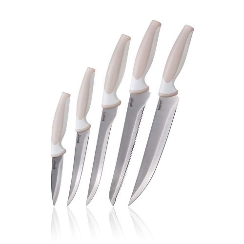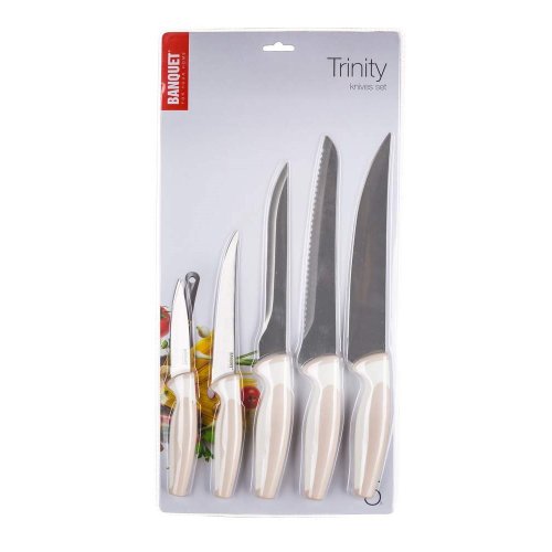5 dílná sada TRINITY obsahuje praktický nůž 18,5 a 23,5 cm, porcovací nůž 32 cm, vykošťovací nůž 30 cm a nůž na chléb 32 cm. Ocelové nože patří mezi nepostradatelné pomocníky v každé kuchyni. Výběr vhodného nože nám usnadní krájení či porcování potravin.