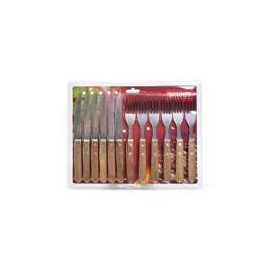 12dílný steakový set PARTY, steakové příbory s dřevěnou rukojetí, zubaté ostří pro snadné krájení masa. Vidlička se čtyřmi hroty tl.1,5mm, nůž tl.1,2 mm, rukojeť tl.1 cm, délka 19,6 cm, nerez 18 / 0. Steakové příbory se hodí nejen pro domácí využití, ale také pro zahradní párty a grilování. Zubaté ostří nože si snadno poradí s každým druhem masa.