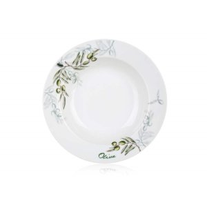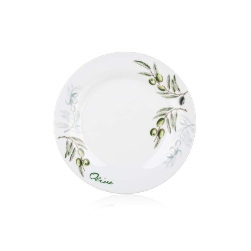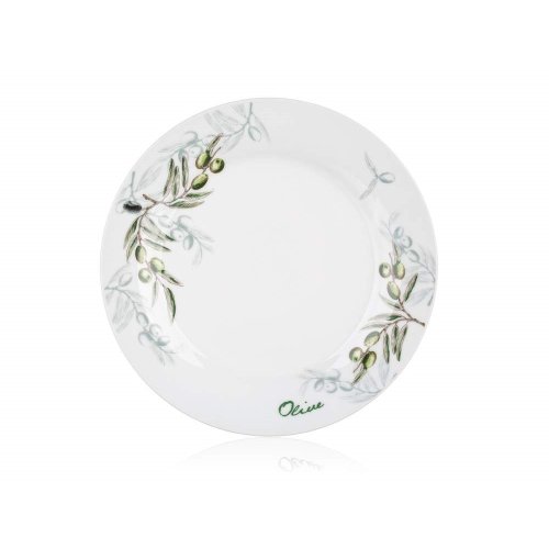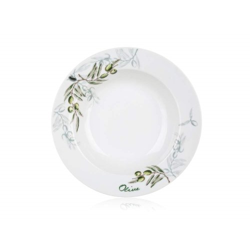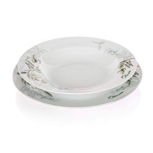18dílná talířová sada OLIVES s dekorem olivy se skládá ze 6 ks hlubokých talířů 21,5 cm, 6 ks mělkých talířů 24 cm a 6 ks dezertních talířů 19 cm. Sada je vyrobena z porcelánu, je vhodná do myčky a mikrovlnné trouby.