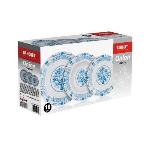 18dílná talířová sada ONION s dekorem cibulák se skládá ze 6 ks hlubokých talířů 21,5 cm, 6 ks mělkých talířů 24 cm a 6 ks dezertních talířů 19 cm. Sada je vyrobena z porcelánu, je vhodná do myčky a mikrovlnné trouby.