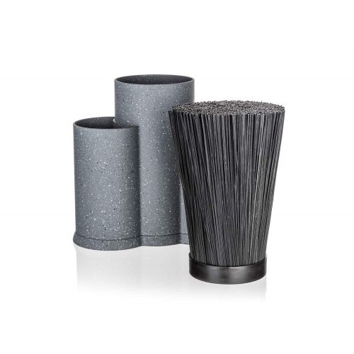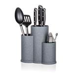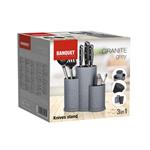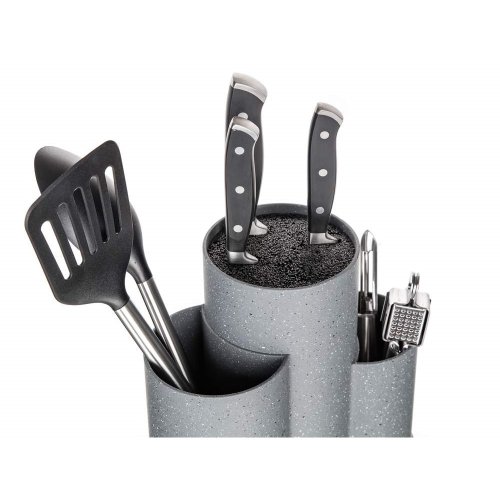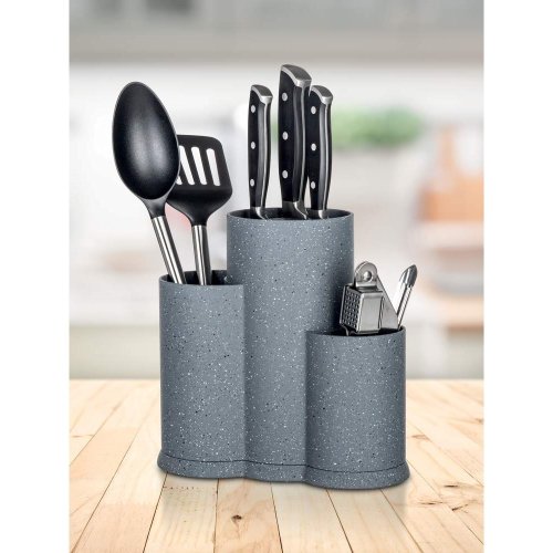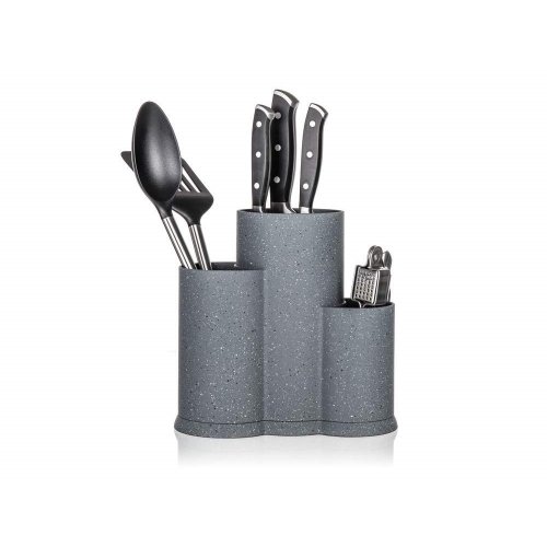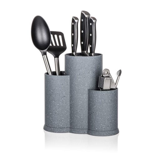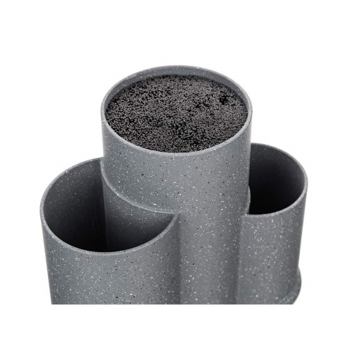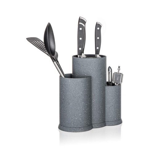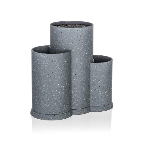 Praktický stojan na nože GRANITE Grey, je vyplněn vložkou s plastovými štětinami. Lze ji jednoduše vyjmout a stojan vymýt. Stojan je určen pro všechny typy nožů. Kromě hlavní části pro skladování nožů má ještě další dvě přihrádky na ukládání Vámi často používaného kuchyňského náčiní. Nejen keramické nože je potřeba správně skladovat, aby nedošlo k poškození ostří a k tomuto účelu jsou ideálně vhodné právě stojany se štětinami. Chrání nože před mechanickým poškozením, vhodně doplňují kuchyňskou pracovní desku a náčiní tak máte neustále po ruce. Díky tomuto třídílnému stojanu tak budete mít vždy po ruce vše, co k přípravě pokrmů potřebujete, nejen nože, nůžky, ale i obracečky, vařečky a další nezbytné pomůcky.