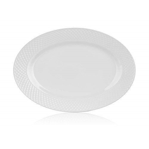 Oválný talíř DIAMOND 34,5 x 24,2 cm v barvě bílé se zdobným reliéfem, vyrobený z keramiky. Lze použít do mikrovlnné trouby i do myčky na nádobí na běžné domácí použití.