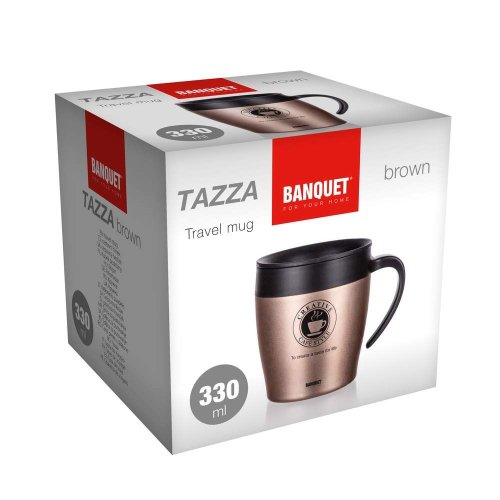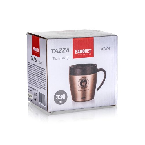 Dvoustěnný cestovní termohrnek TAZZA v hnědé barvě, je vhodný na teplé i studené nápoje. Vnější část je vyrobena z nerezi 201, vnitřní část z nerezi 304 a víčko z plastu. Využitelný objem je 330 ml. Tělo hrnku je vakuové, udrží nápoje déle horké či studené. Víčko není nepropustné, doporučujeme uchovávat ve svislé poloze.