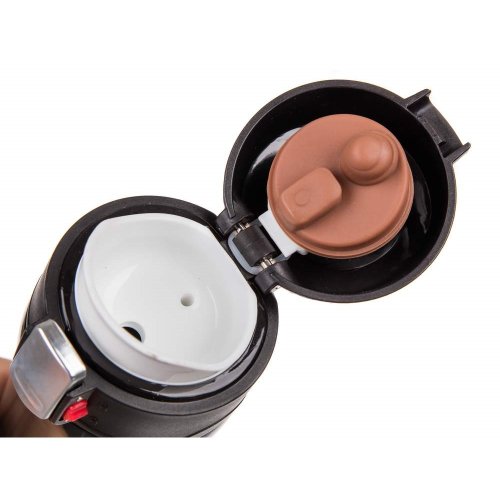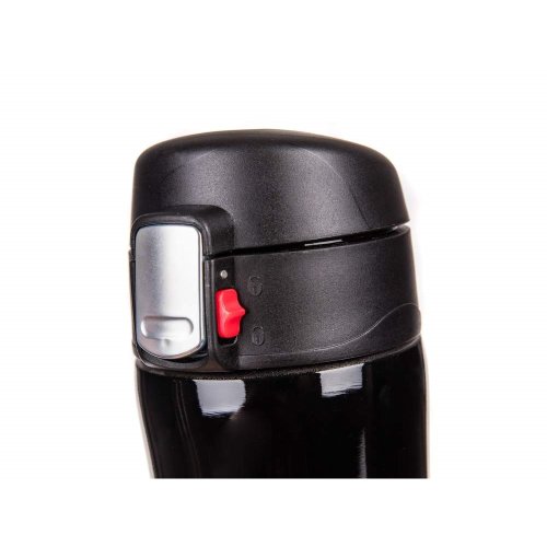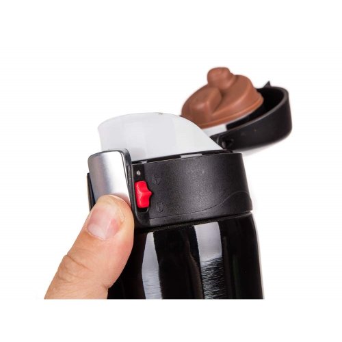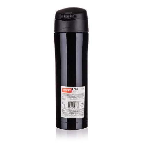Cestovní termoska BODO o objemu 430 ml má vnější i vnitřní povrch z nerezi a plastové vyklápěcí víčko. Díky dvoustěnnému provedení si udrží nápoj déle svou teplotu. Víčko se otevírá stisknutím pojistky, u které je zámek zabraňující nechtěnému otevření termosky.