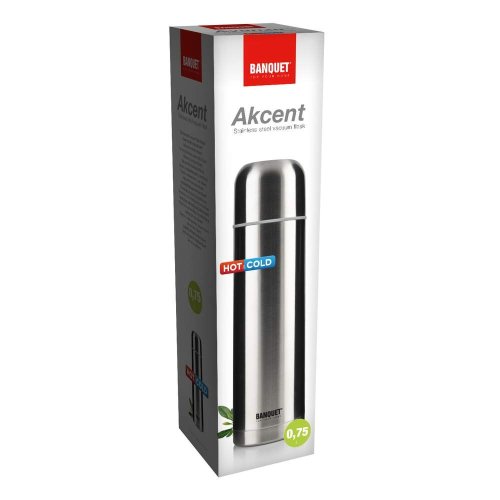 Nerezová termoska AKCENT 0,75 l, dvouplášťové provedení, nerez 201 - vnější i vnitřní povrch, plastový uzávěr - clip pro snadné použití (jedním stiskem se termoska otevře, druhým zavře), víčko termosky lze použít jako pohárek na pití. Nerezové termosky jsou velmi odolné a bezpečné, nehrozí rozbití vložky či opaření při manipulaci. Teplotní pokles je závislý na teplotě nápoje při plnění, množství nápoje a teplotě okolí.