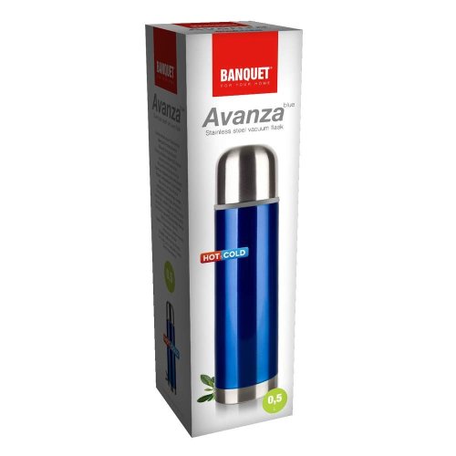 Nerezová termoska AVANZA Blue 0,5 l ve dvouplášťovém provedení, je vhodná pro horké a studené nápoje. Vnější strana je opatřena metalickým povrchem. Plastový uzávěr - clip pro snadné použití (jedním stiskem se termoska otevře, druhým zavře), víčko termosky lze použít jako pohárek na pití. Nerezové termosky jsou velmi odolné a bezpečné, nehrozí rozbití vložky či opaření při manipulaci. Teplotní pokles je závislý na teplotě nápoje při plnění, množství nápoje a teplotě okolí.