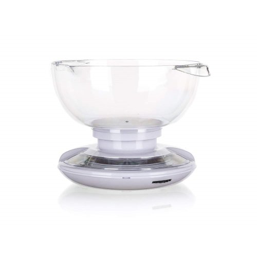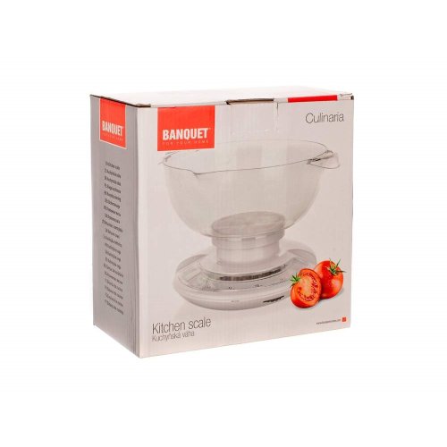 Mechanická kuchyňská váha 5 kg CULINARIA, objem mísy 2 L, materiál: plast ABS tělo (bílá barva), mísa průhledný plast. Váživost 5 kg, rozlišení 50g. Rozměr: 20 x 21 x 17 cm, hmotnost 525 g.