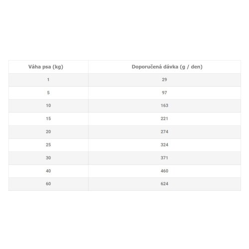 Analytické složky: Hrubý protein 26 %, Hrubý tuk 16 %, Omega mastné kyseliny 3 0,30 %, Omega mastné kyseliny 6 3 %, Hrubá vláknina 3 %, Hrubý popel 8 %, Vápník 1,60 %, Fosfor 1,20 %.