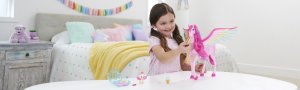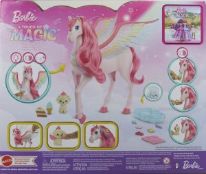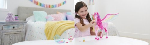 Nechte fantazii stoupat na křídlech tohoto růžového pegase Barbie®! Děti si mohou zahrát své oblíbené scény z filmu Barbie a dotek kouzla! nebo si vymýšlet vlastní fantastická dobrodružství. Kouzelný Pegas přichází s 10 různými doplňky a pyšní se světly a zvuky! Stiskněte náhrdelník pegase nebo pohněte křídly a spustí se duhová světla a magické zvuky včetně hudby z filmu. Pegas Barbie® má růžovou hřívu a ocas a také třpytivá duhová křídla! Mezi doplňky patří kouzelné štěňátko, sladké pamlsky, hřeben a další roztomilé doplňky. Barvy a vzhled výrobku se mohou lišit.