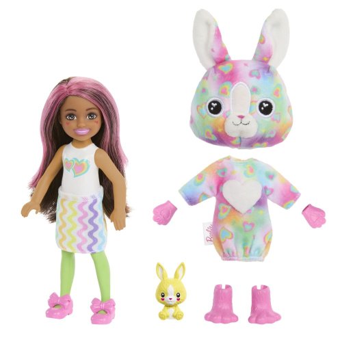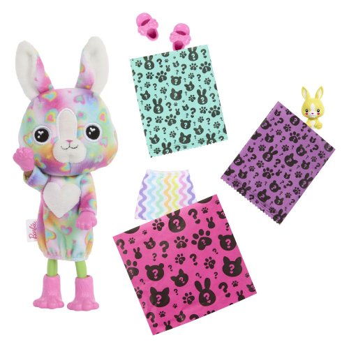 Panenky Barbie® Cutie Reveal™ Chelsea™ barevné sny nabízejí ten nejrozkošnější zážitek z rozbalování a 6 překvapení! Kterou panenku odhalíte? Ve hře je zajíček, zebra, tučňák nebo dalmatin - proměněný z černobílého do snového duhového kožíšku. Po sundání plyšového kostýmu odhalíte panenku Chelsea™ a objevíte další překvapení jako sukýnku a mini zvířátko, které ladí s kostýmem panenky. Otočením plyšového kostýmu získáte oversized kabátek a z hlavičky kostýmu zase pelíšek pro domácího mazlíčka.