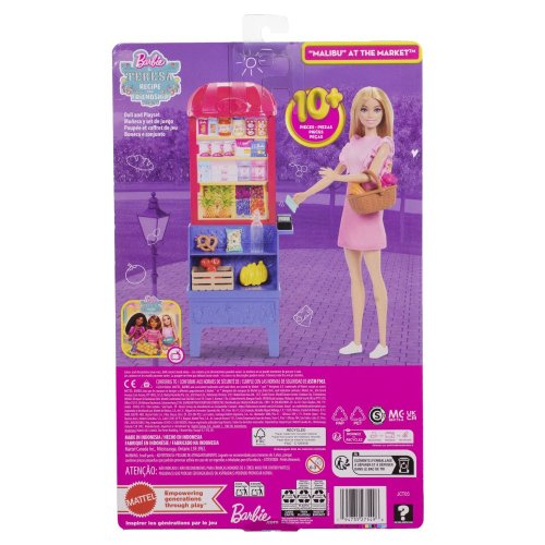 Vydejte se na nákupy s panenkou Barbie® a tímto báječným herním setem na nákupy! S košíkem, potravinami, kreditní kartou a automatem na karty mohou děti pomoci Barbie® najít ingredience pro její další recept!
