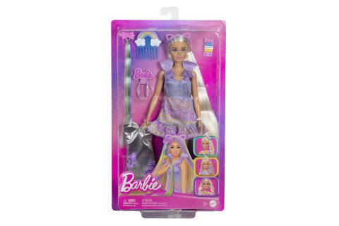 Panenka Barbie miluje parádění a potěší všechny malé milovnice vlasových proměn! Panenka s extra dlouhými vlasy s barevnými pramínky čeká na nový účes – klidně každý den jiný. Součástí balení je 10 doplňků na česání a styling, včetně duhového příčesku, mašlí, čelenky s kočičími oušky a náhradního oblečku. Malé stylistky si zamilují kombinování outfitů i tvoření copánků, drdolů nebo pestrobarevných účesů. Skvělý dárek pro děti od 3 let. Panenka nemůže stát samostatně. Barvy a vzhled výrobku se mohou lišit. Věk 3+
