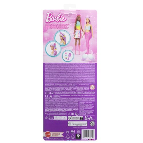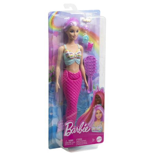 Tato pohádková panenka Barbie® mořská panna má extra dlouhé a pestrobarevné růžové vlasy! Děti si mohou svou mořskou pannu upravit pomocí přiložených vlasových doplňků, pak ji rozčesat a opakovaně si s ní hrát do nekonečna. Pohádkové prvky, jako jsou živůtek inspirovaný oceánem a ombré ocasní ploutve, dodávají této panence Barbie® mimořádný šmrnc. Panenka neumí samostatně stát. Barvy a vzhled výrobku se mohou lišit.