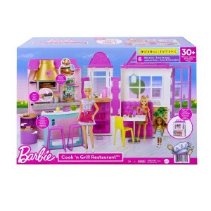 Tato herní sada z prostředí rychlého občerstvení má moderní barevný design, šest hracích ploch a obsahuje celkem více než 30 dílů. Zažehne tak v dětech jiskru pro nekonečnou zábavu plnou fantazie. Děti mohou panence Barbie® (není součástí balení) pomoci přijímat objednávky u výdejního okénka nebo usadit až čtyři hosty do vnitřního posezení u pultu, případně do boxu na zahrádce. Potom mohou zamířit do kuchyně obracet burgery na otočném grilu, aranžovat zákusky na otočném dezertním pultíku nebo dát pizzu do pece a dívat se, jak mění barvu, když je „upečená“! Díky celkem více než 30 dílům a mnoha příležitostem pro vyprávění příběhů si mohou děti s panenkou Barbie® na kuchařku, servírku, zákaznici nebo na všechny tři najednou! Rozměr balení: 46 x 32 x 14 cm Vhodné pro děti od 3 let