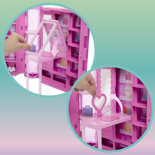 Barbie® Šatník snů v pastelových barvách s panenkou je vytvořený pro maximální zážitek ze hry s módou a přináší vychytávky ve formě rozkládání šatníku, má 2 stojany na oblečení, botník, kosmetický stolek, zrcadlo a koutek pro domácí mazlíčky.