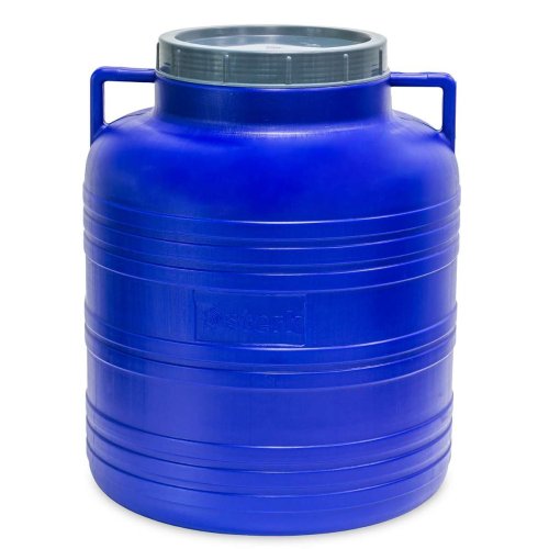 Plastová širokohrdlá konev (sud) se šroubovacím víkem o objemu 60 litrů. Vhodný ke skladování a přepravě sypkých, kusových a pastovitých hmot v chemickém, potravinářském průmyslu či zemědělství. Sud má potravinářský atest. Tento sud tedy lze používat např. na kvašení ovoce. Sud má tvarované hrdlo, které částěčně plní funkci těsnění (víko není vybaveno těsněním !). Široké kulaté dno má výbornou stabilitu. Průměr 41(35) cm a výška 54(66) cm, hrdlo průměr 23.5(20) cm. Barva bílá nebo modrá dle skladové dostupnosti. Tvarování a rozměry sudu se můžou lišit. EAN 0000042114000 / 6421937090171