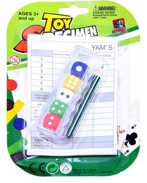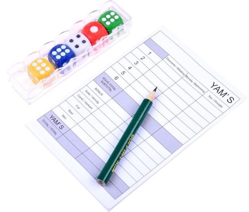Balení obsahuje 5 kusů barevných kostek se zápisníkem pro zapisování bodů a tužku . Velikost kostky: 1,5 x 1,5 x 1,5 cm. Oblíbená hra pro děti i dospělé. Cílem klasické hry v kostky je dosáhnout co největšího počtu bodů. Sada obsahuje: