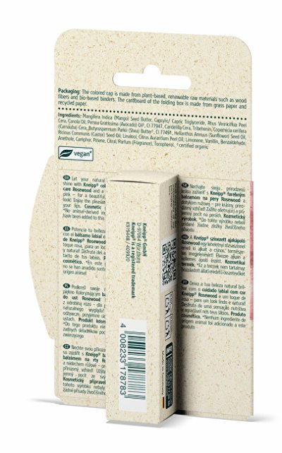 Barevný balzám na rty Kneipp Rosewood je perfektním společníkem pro všední i nevšední příležitost. Jemně barví rty decentním růžovým odstínem inspirovaným přírodou a zároveň o ně celoročně pečuje. Zabraňuje vysoušení rtů a díky obsahu BIO bambuckého másla, vitaminu E a přírodních pečujících olejů zůstanou vaše rty hebké, pružné a chráněné před nepříznivými vlivy okolí. Aplikace je snadná i bez zrcadla, takže balzám můžete mít vždy po ruce v kapse nebo kabelce. Potěší vás také přírodní obal z trávového papíru a recyklovaných dřevních vláken, který je vyroben ze 100% BIO surovin a je šetrný k životnímu prostředí.