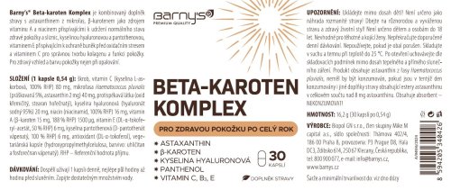 Složení (1 kapsle 0,54 g): škrob, vitamin C (kyselina L-askorbová, 100 % RHP*) 80 mg, mikrořasa Haematococcus pluvialis (práškovaná 5%, astaxanthin 2 mg) 40 mg, protispékavá látka (oxid křemičitý, stearan hořečnatý), kyselina hyaluronová (hyaluronát sodný 95%) 20 mg, niacin (niacinamid, 100 % RHP*) 16 mg, vitamin A (β-karoten 15 mg, 188 % RHP*) 1500 µg, vitamin E (DL-α-tokoferyl-acetát, 50 % RHP*) 6 mg, kyselina pantothenová (D-pantothenát vápenatý, 100 % RHP*) 6 mg, antioxidant (DL-α-tokoferol), vegetariánská kapsle (hydroxypropylmethylcelulosa, barvivo: uhličitan a fosforečnan vápenatý).